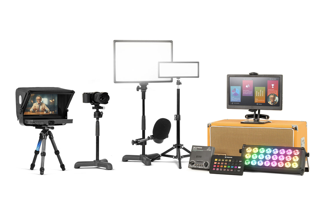 Includes 2 cameras and teleprompter(s), a microphone, 2 LED lights, and a 2 Hour Consultation with one of our technicians to build your kit and dial in your lighting, mic placement, and background.